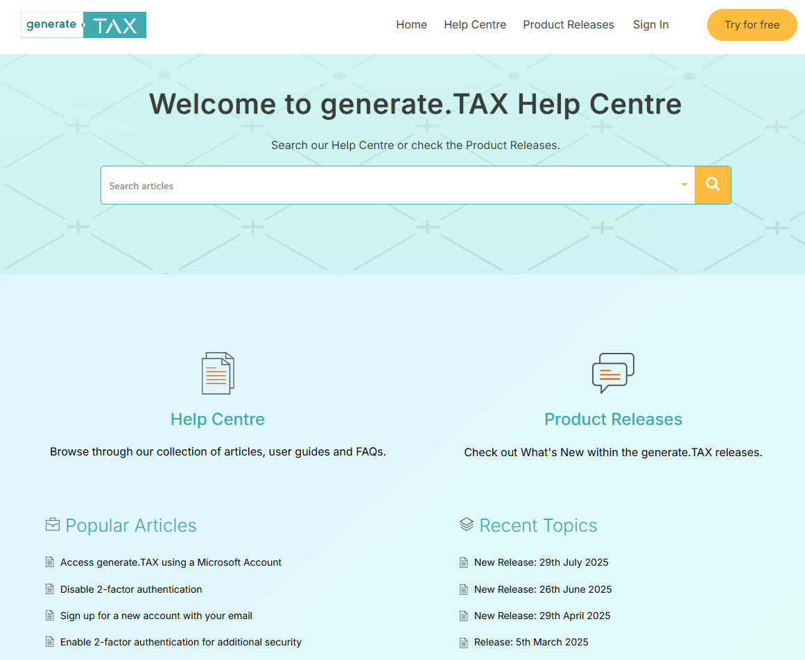 Our newly revamped Help Centre now includes a variety of support articles and guides on how to use generate.TAX. You can also find detailed information about all our product releases there. If you have any feedback on how to make it even better, feel free to reach out to the team with your suggestions.