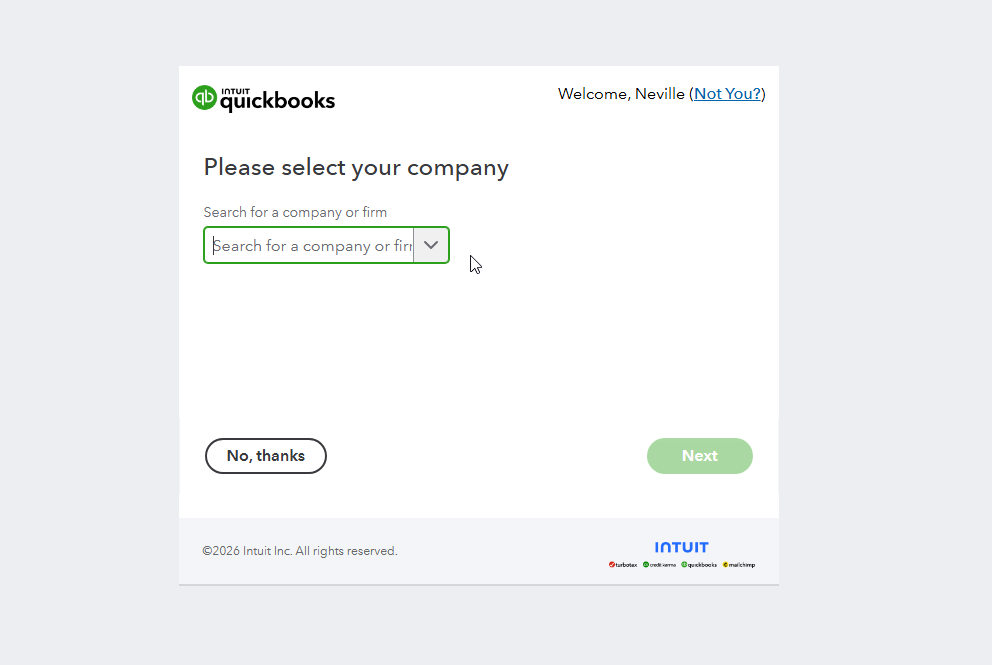 4) Select the Quickbooks organisation you wish to connect and click on Next.