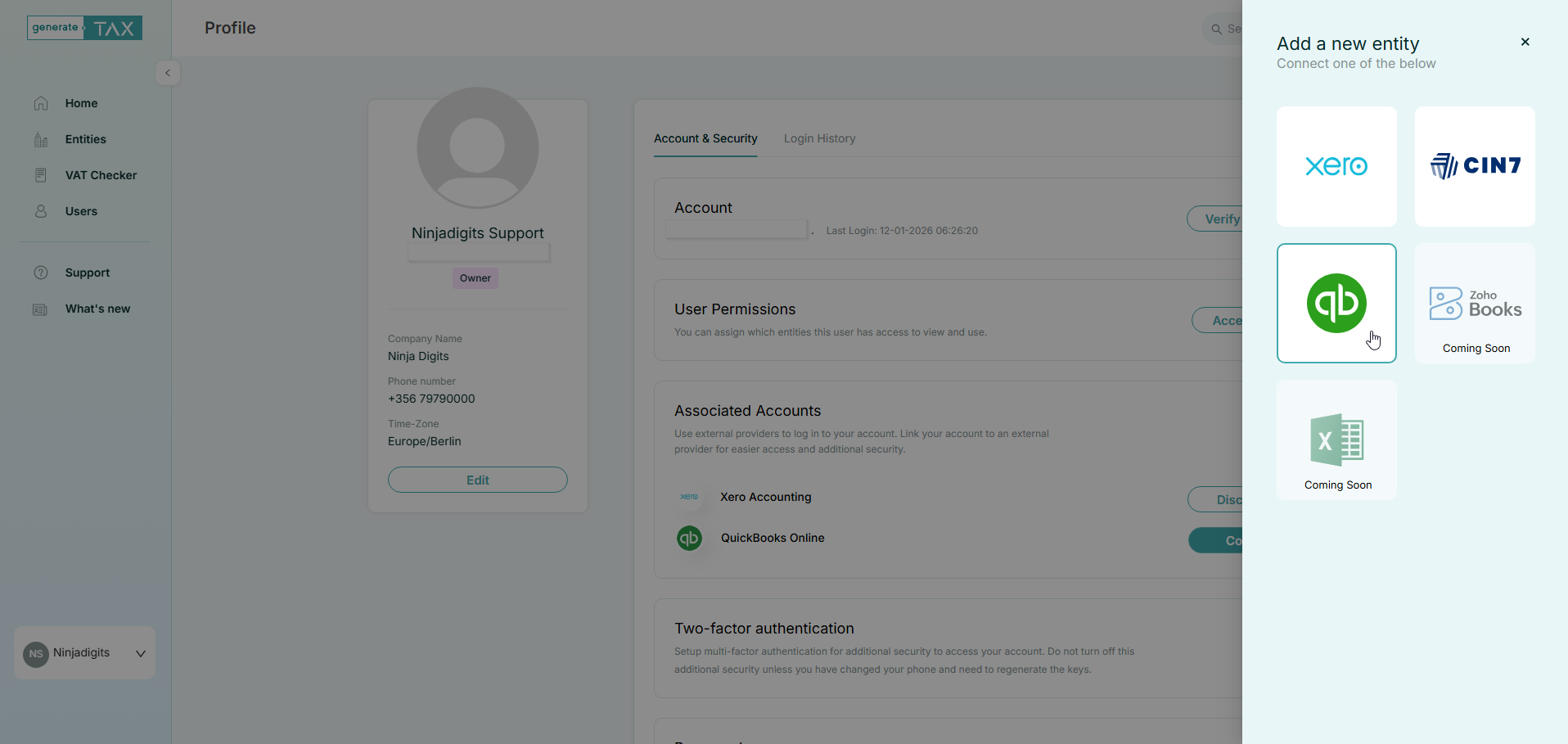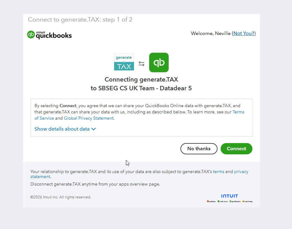 Success! You have added a Quickbooks organisation to generate.TAX.
