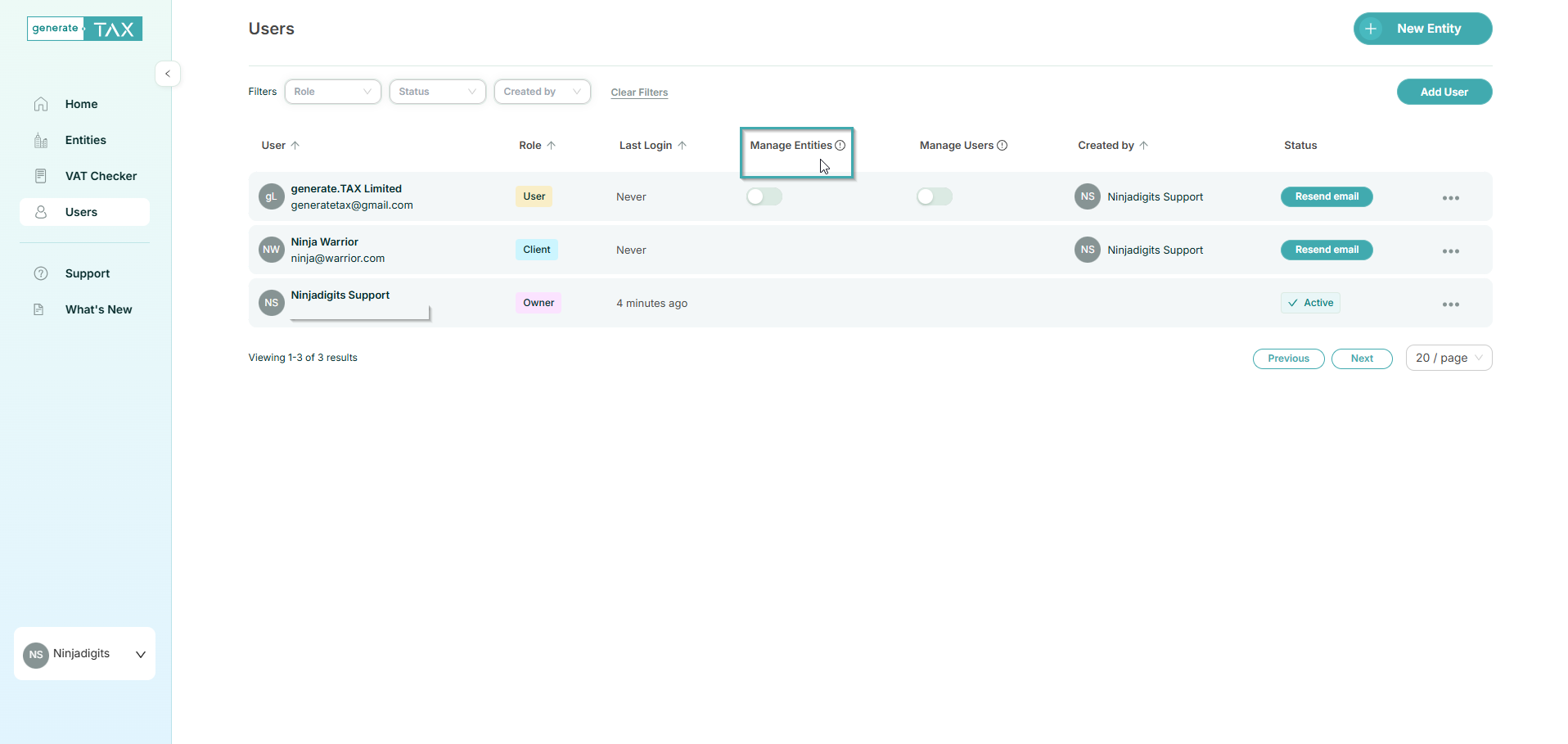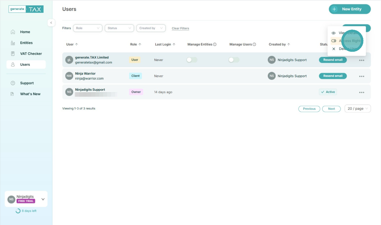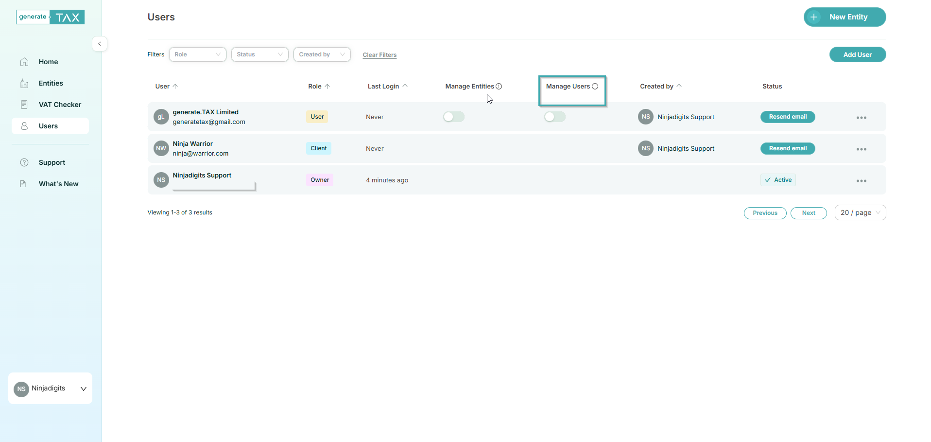 This guide offers step-by-step instructions for adding users. 1) Click the Users icon. 2) In the Users page, click the Add a user button. 3) Choose between User or Client and enter the First Name, Last Name and the Email Address. 4) Click Send Invite ...