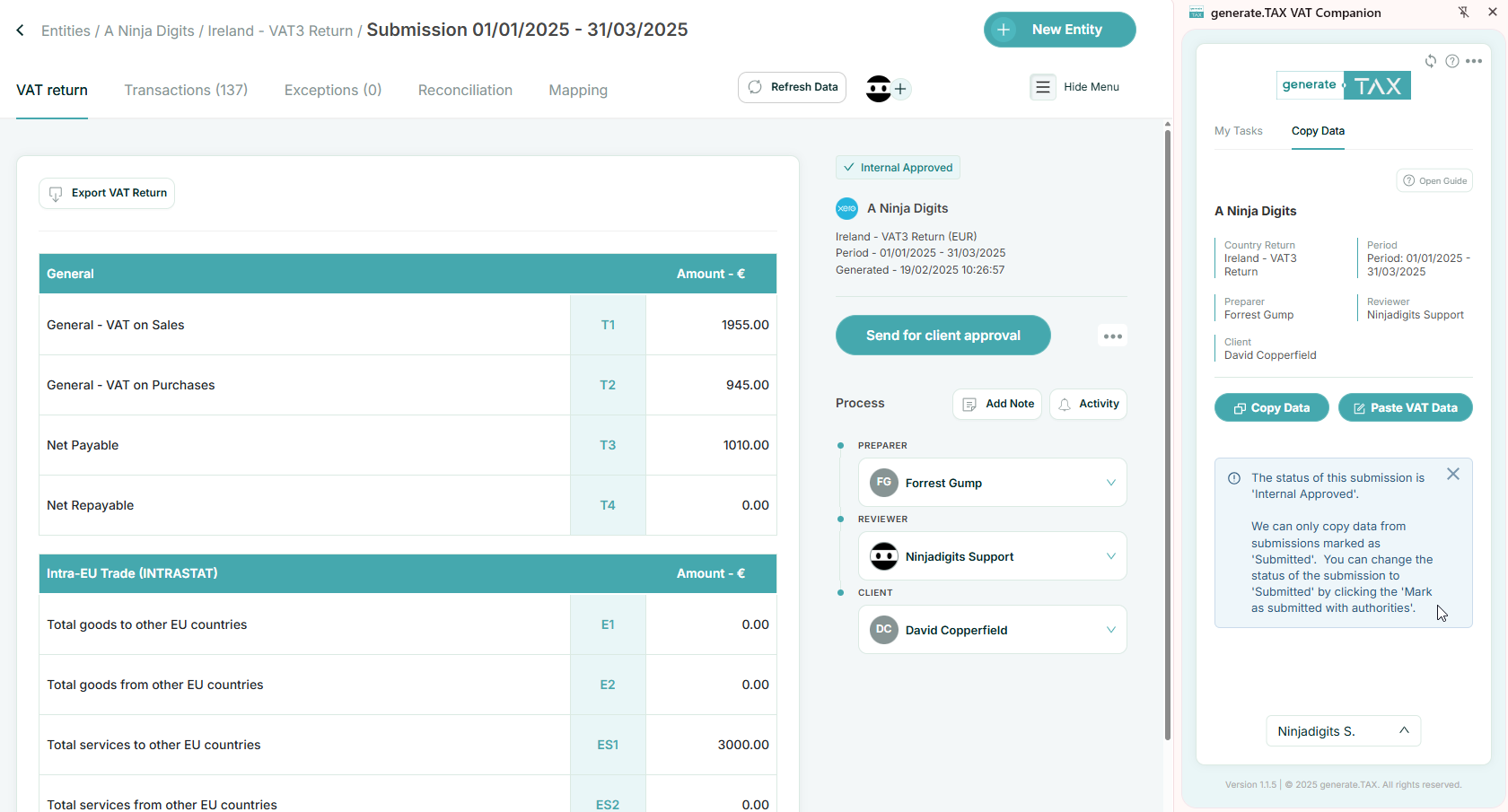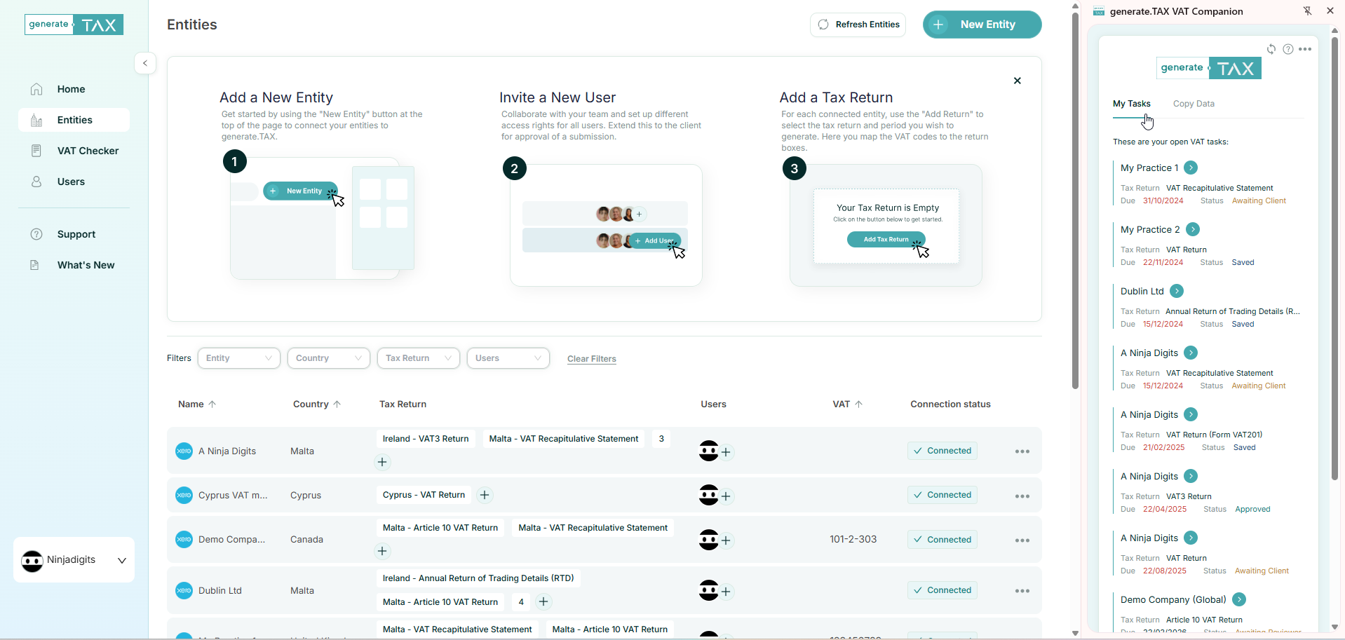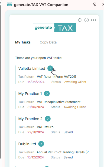 The generate.TAX VAT Companion extension works with Submitted reports for the following returns: 'Malta - Article 10 VAT Return', 'Cyprus - VAT Return', and 'Ireland - VAT3' and 'UAE VAT return'.