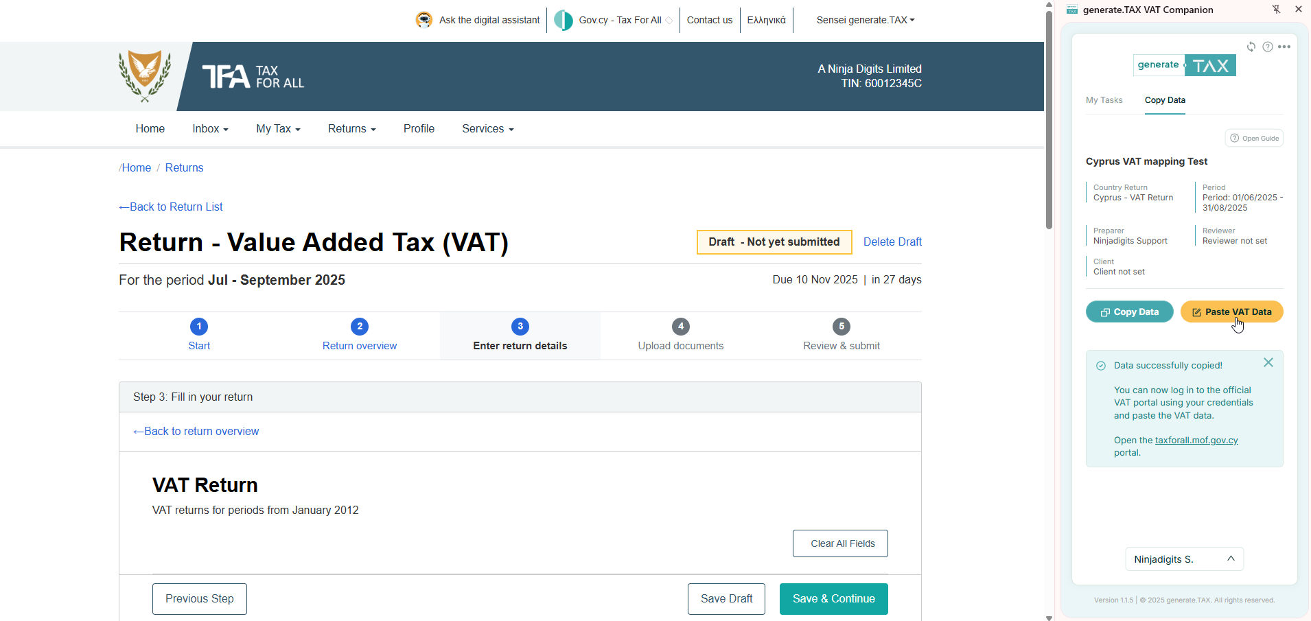 11) The process is the same for Cyprus — open the official VAT portal, click the generate.TAX extension icon, select Paste VAT Data, and the fields will automatically populate. Then click Save as Draft before submitting.