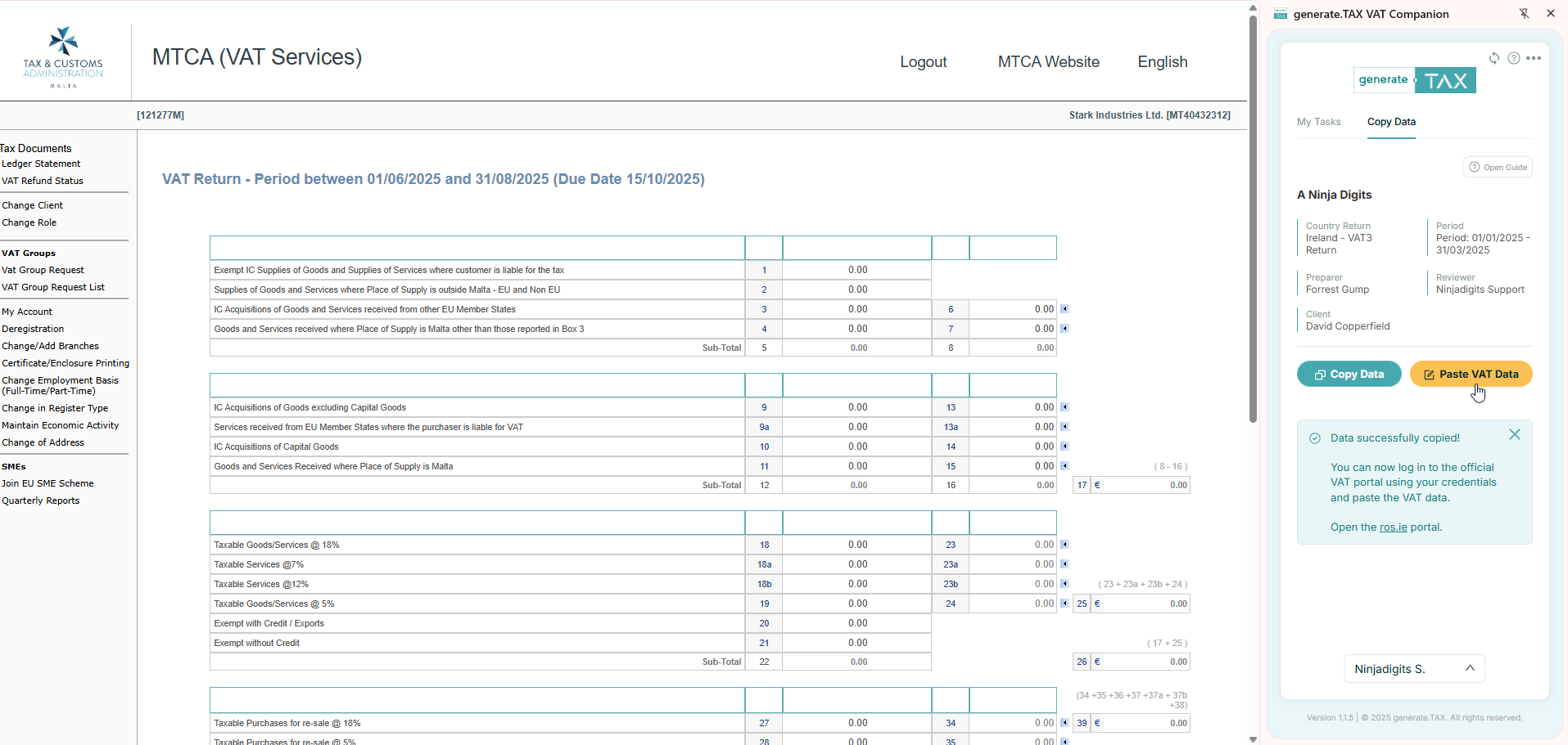 10) In the official VAT portal (for example, Malta), you’ll initially see all fields set to 0.00. Click the generate.TAX extension icon, then select Paste VAT Data in the pop-up. Once the data is successfully pasted, the form fields will be automatically populated. You can then click Save as Draft to save your changes before submitting