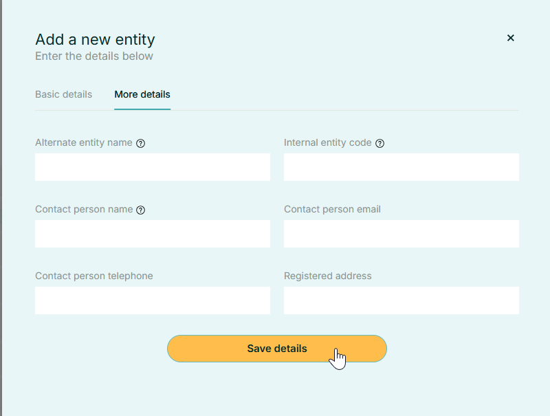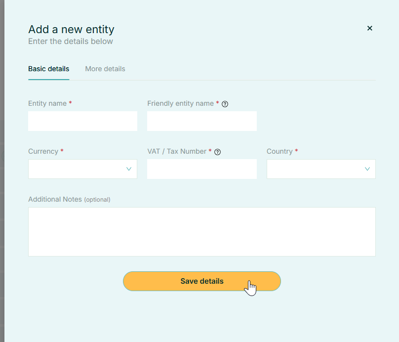 2. Enter the required entity details, such as Entity Name, VAT Number and Country. Fields marked with a * are mandatory.