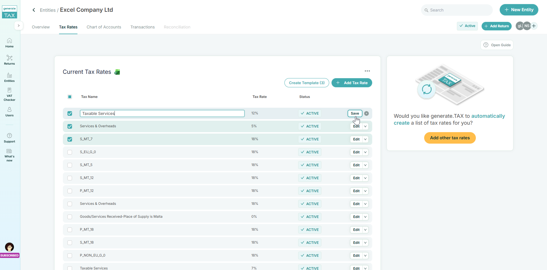 4. In the Tax Rates tab, you can view all tax rates for the entity, edit tax names and save your changes.