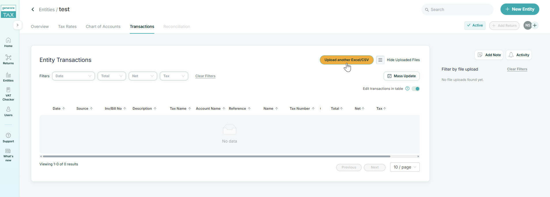 4. After creating the entity, upload your transactions using a Microsoft Excel or CSV file via the Upload tool in the Overview tab. You can use the provided template or your own file.