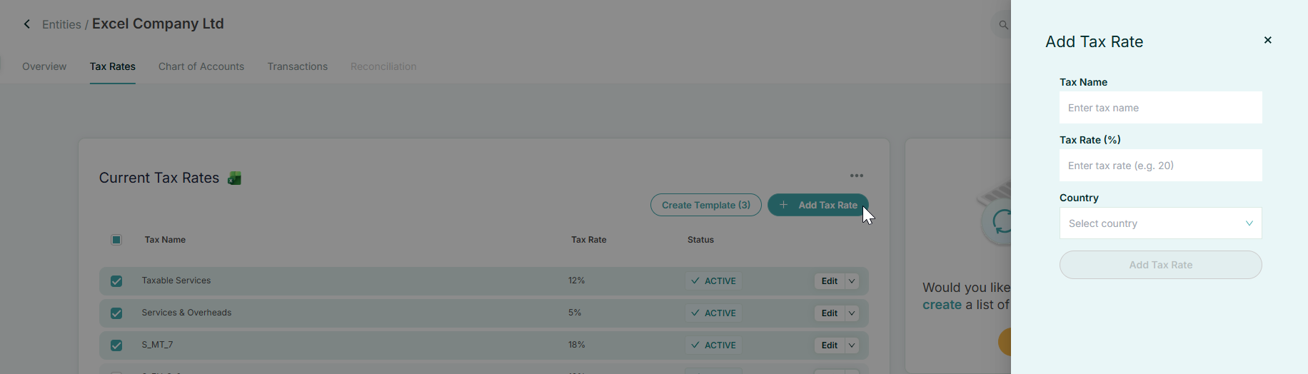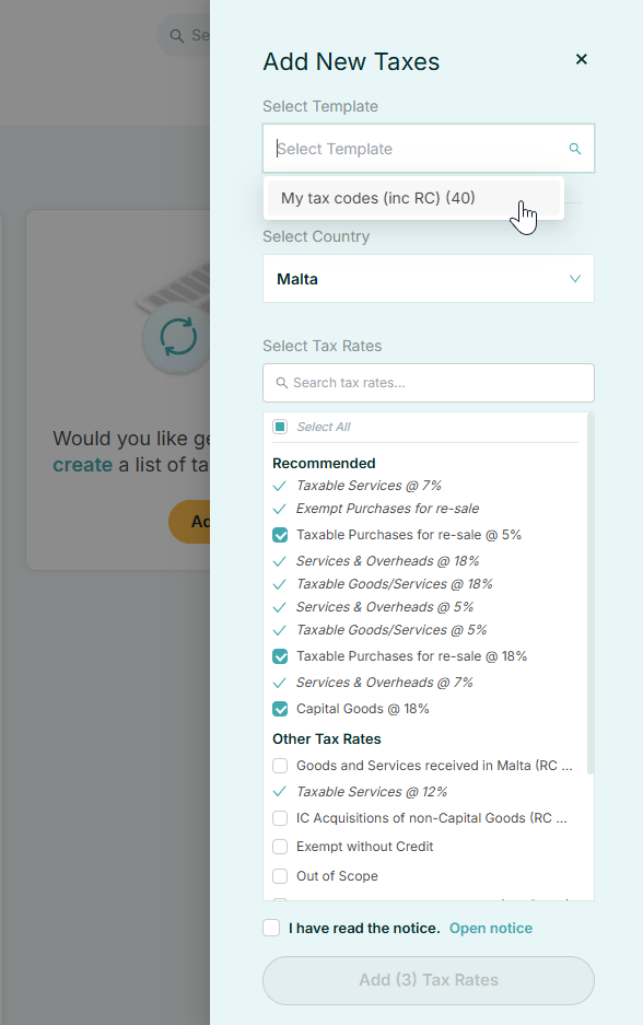 5. New tax rates can be added by clicking the Add Tax Rate button. You can enter them individually, use a template or select from the country-specific drop-down menu.