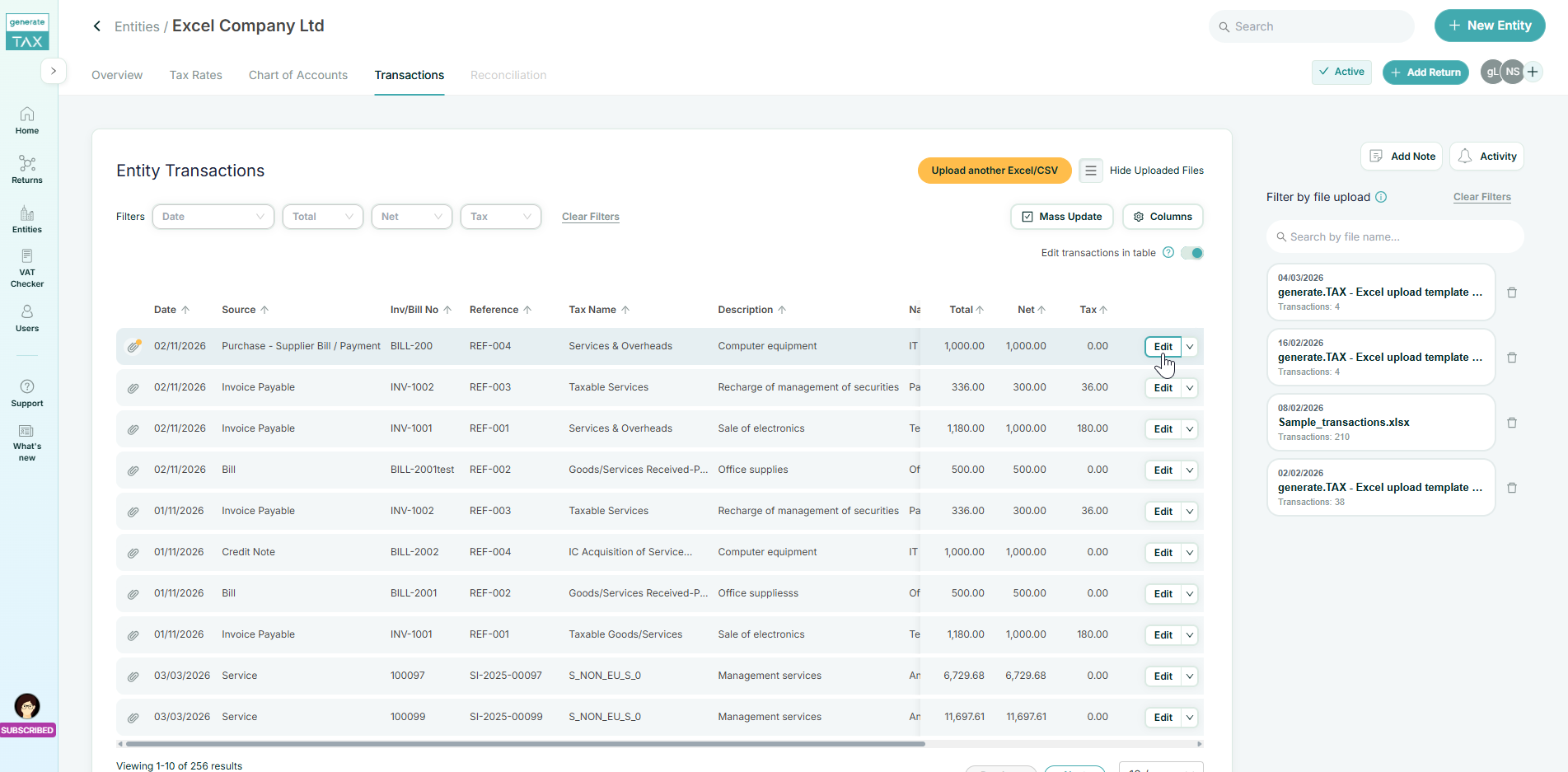 You can now create Excel Entities to bring transaction data into generate.TAX directly from Microsoft Excel or CSV files. This is ideal for clients who maintain manual books or use legacy systems that lack direct API integrations. generate.TAX can help with accounting systems such as Sage, Microsoft Dynamics or NetSuite which do not have a native VAT module.