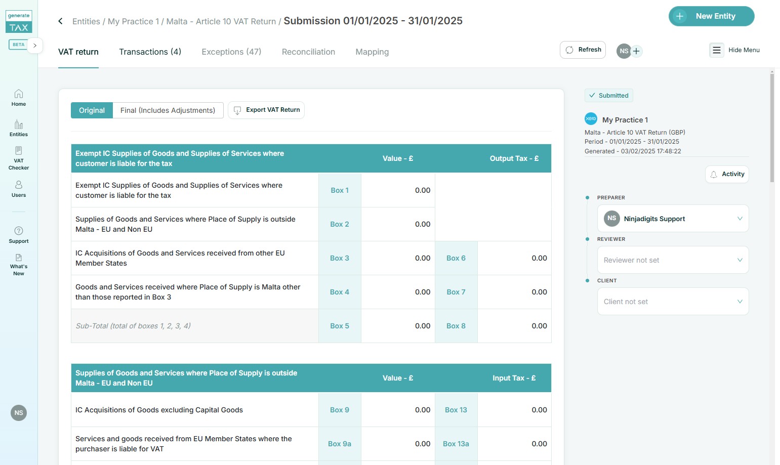 7) Within the VAT Return, you can switch views between the Original submission and the Final version including the Adjustments.