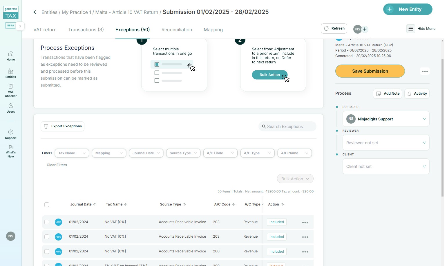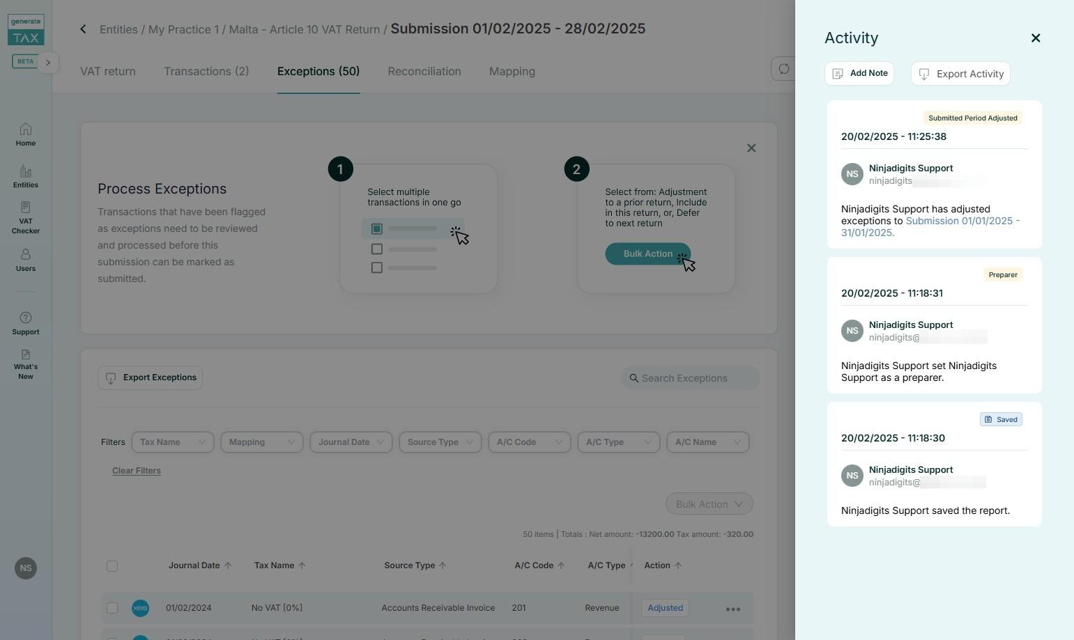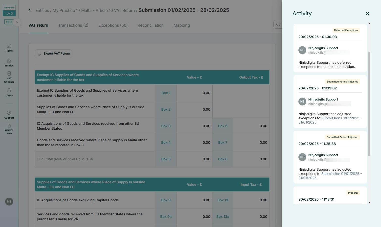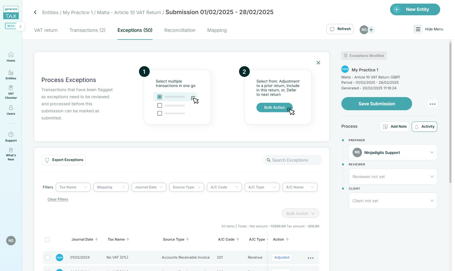 After submitting the current return, you can go back to the previous submission and review the details of the exceptions included. The necessary adjustment can then be submitted to the authorities outside of generate.tax.