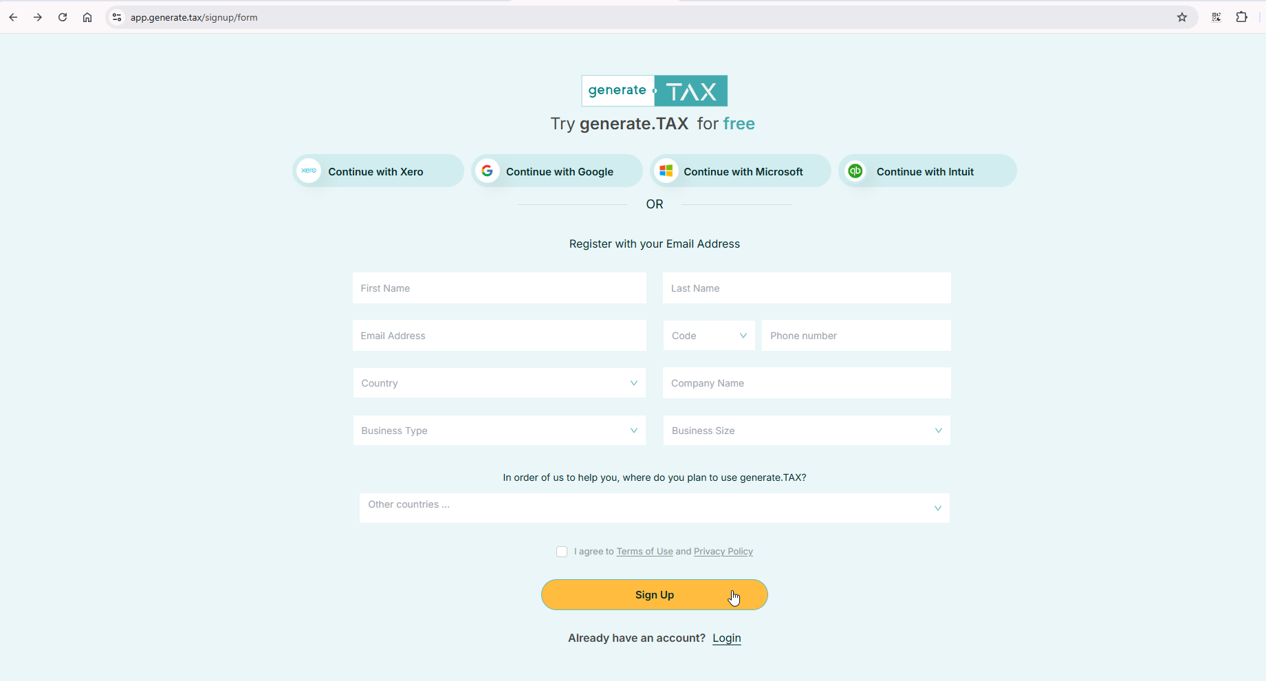 2) Fill in the required fields, including your contact details and the countries where you wish to use generate.TAX, then agree to the